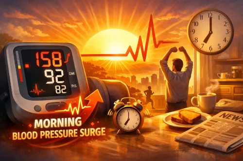 Blood pressure is supposed to rise in the morning. As you transition from sleep to waking, your sympathetic nervous system activates, cortisol and catecholamines increase, and your cardiovascular system prepares for upright activity [1][2]. A moderate rise — roughly 20–25 mmHg systolic from the lowest overnight value — is considered a normal part of the circadian rhythm. The concern begins when that rise is exaggerated, particularly if it’s consistently above about 35–55 mmHg over the nighttime low, or if your morning readings persistently sit above 135/85 mmHg at home [3][4].